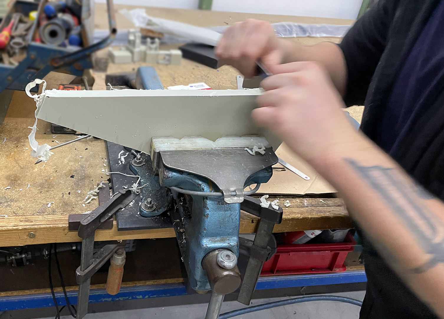– Vermittlung der Kenntnisse in der Kunststoffbearbeitung – Heften, Schweißen, Kleben, Sägen, Bohren, Drehen, Fräsen etc.